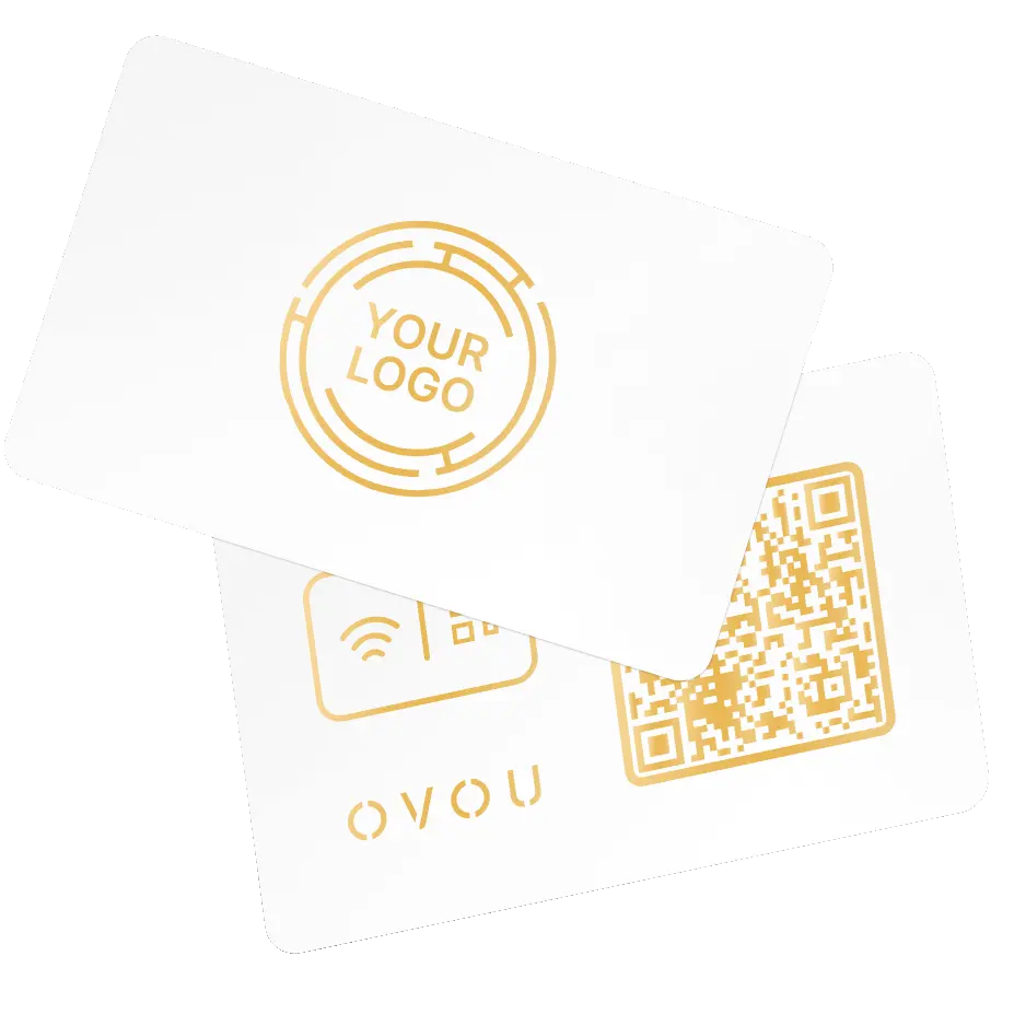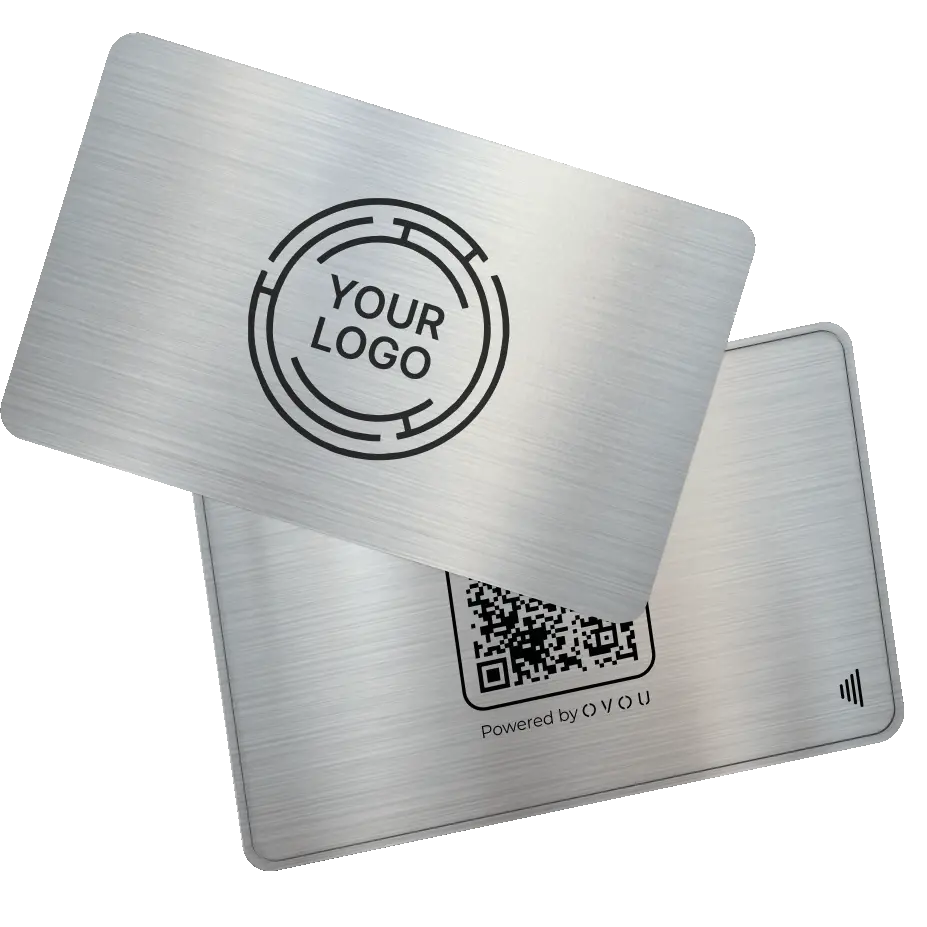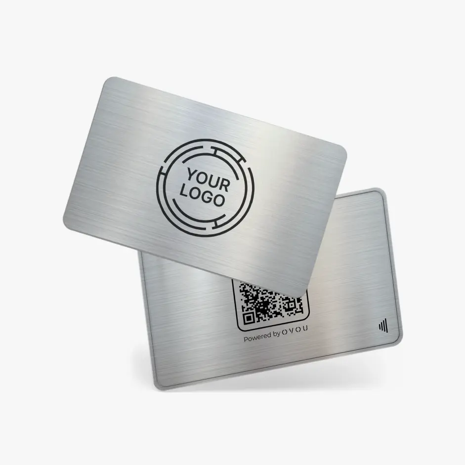 Notre carte standard est fabriquée à partir d'un mélange de haute qualité PVC/PET (similaire aux cartes de crédit premium). Finie en noir mat ou blanc mat avec une impression en foil argent ou or. Vous pouvez également personnaliser votre carte en utilisant l'impression UV, ce qui donne un toucher rugueux à votre logo.